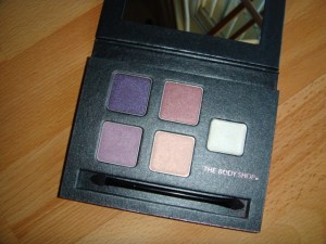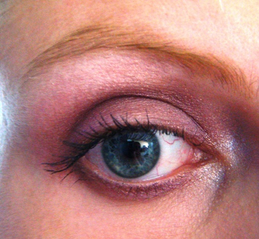 First up, you take the second palest shadow, Lilac Mist, and sweep it over your entire eye lid. Then, you hook up a bit of the second darkest colour, Damson Velvet and use it to define your crease. (I put it on a bullet brush, closed my eyes and dusted it in an upside down ‘U’ shape from the inner corner of my eye to the outer corner, extending it JUST A TAD to the side of my face. I also rubbed a little of this dark shade on the outermost corner of my eyelid and blended it in with Lilac Mist towards my nose. To clean it up, I whipped out my foundation sponge and gently buffed the bit where I extended it past my eye, so the ‘wing’ didn’t look too harsh or extend too far.)