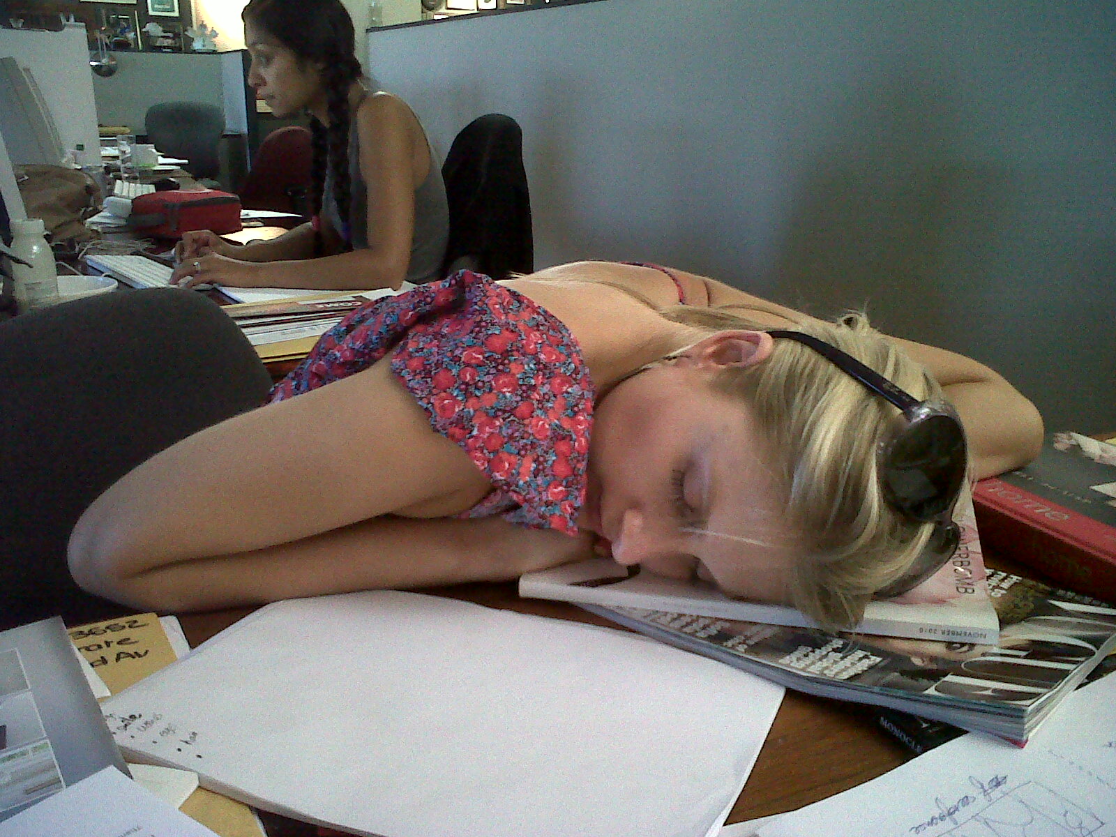 Check out art director Suaad in the background. You can see she’s feeling the summer crunch too, hunching over her Mac like a desk zombie.