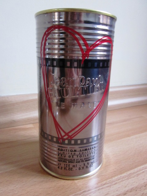 The heart design is stamped onto the cellophane that covers each tin. As I had to remove it to open them, I made a point of leaving Le Male sealed so as to show you what it looks like. Check it out: