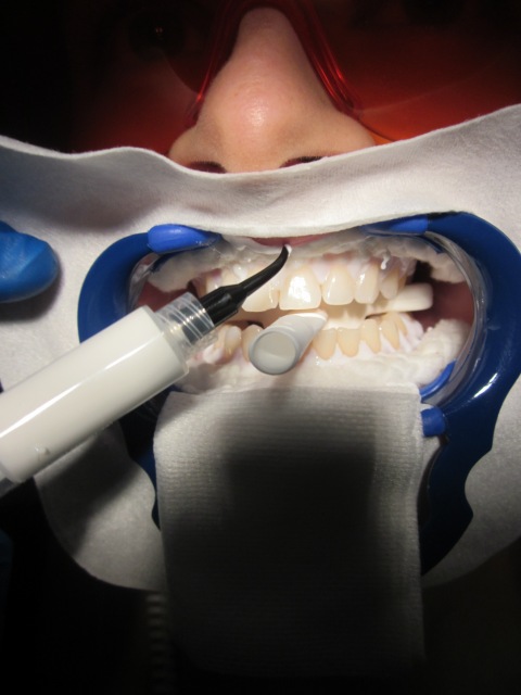 To begin, Emma piped a weird white substance onto my gums that went on like paste, but soon hardened up to protect them from the peroxide.