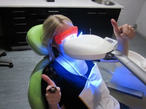 She then painted a clear whitening gel that contained 25% peroxide onto my teeth. To speed up its penetration, she hooked me up to a fancy light machine.