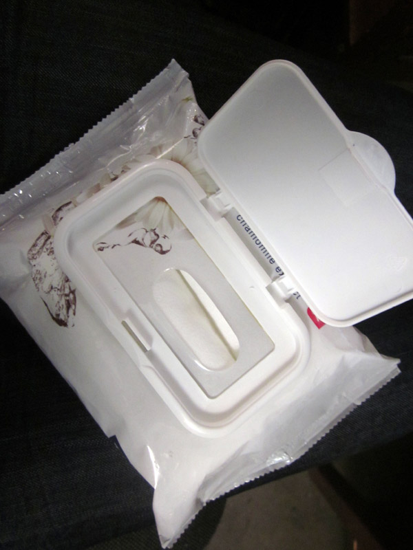 See the nifty 'seal'? I like this because I can open and close the wipes with ease and don’t have to worry about them drying out. (I’ve used other wipes before that just open and close via a sticky-tape like seal. Once you’ve opened and closed them a few times, the seal loses it’s ‘tackiness’, refuses to close and then your wipes dry out, rendering them v. expensive tissues).