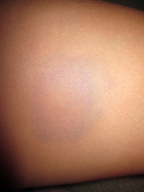 As my bruise was a zesty mix of blue and purple, it was best to treat it with red and yellow. Thus, I gave it a nice dusting of a v. reddish coloured blush (MAC Peachykeen) which immediately made it look better. (I could’ve also rubbed a bit of red lippie on it, but I actually don’t own any… only red lip gloss…)