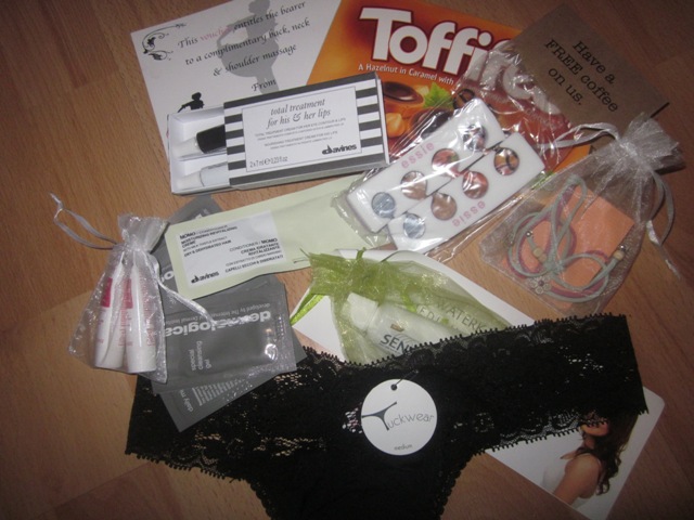 A gift voucher entitling me to a massage at the salon (woohoo!), various samples of cosmetics stocked by Petticoat (think Davines, Guinot and Dermalogica), Tuckwear undies, a BriteSmile discount voucher attached to a mini Sensodyne toothpaste, Essie toe seperators, and a card that gets you a free coffee at Truth (thanks Dave!).