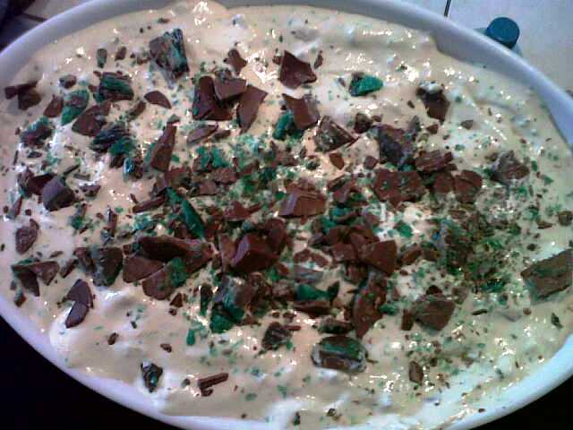 Garnish generously with the fourth crushed Peppermint Crisp.