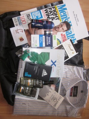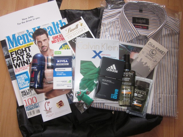 This puppy included a the latest cop of Men's Health, a Pringle sakkie, Brooksfield shirt, Calvin Klein trunks, Adidas fragrance, Nivea for Men goodies, Kerastase hair treatment, Lindt slab and a R100 voucher from Old Khaki. Sjoe!