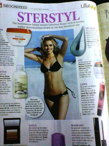 The other day I interviewed Lieschen Botes regarding her can’t-live-without-them cosmetics for Huisgenoot and YOU and I see the piece has finally made it to the shelves.