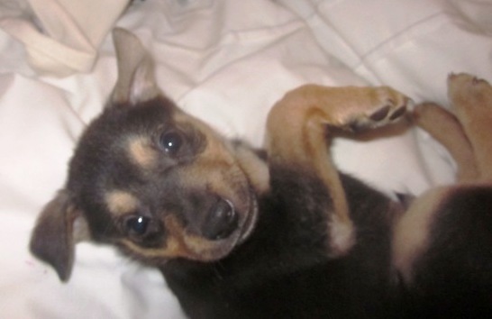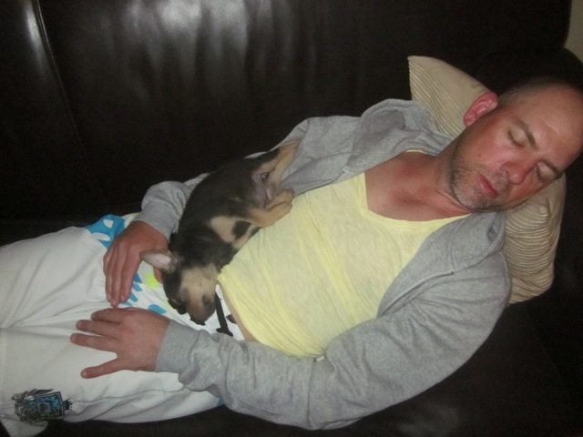 After sleeping the whole night through between Mike and I, he got up at around 7AM to bounce around and play. He’s so happy and sweet and good-natured so I don’t think those kids ever hit or abused him aside from the odd ‘collar’-tug, which was clearly inflicted to send my bleeding heart into overdrive…