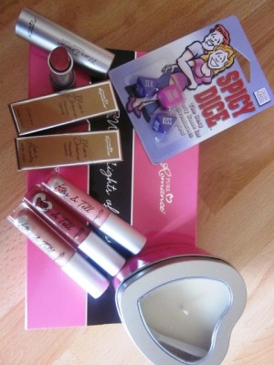 It included items from their make-up line which I’ll chat about in another post as well as Spicy Dice, a Burning Desire soy massage oil candle and mini Night’s of Passion Kit.