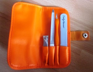 It includes a metal nail file, clipper, cuticle groomer and three-way buffer in a nifty orange carry case. The cuticle groomer is great ‘cos it’s nice and sharp but not so much that it damages your nail bed. I also like that the little rubber ‘cuticle pusher’ on the back is nice and hard so you can actually get some use out of it. (The last two cuticle pushers I bought were so ridiculously soft that they were completely ineffective and I ended up throwing them away.) The metal nail file works well and has two different grains. (Still, if your nails are very soft like mine it’s best you stick to a regular emery board.) The most impressive tool in the kit, however, is the buffer. I’d been using a Ms. Manicure buffer beforehand and this one beats it hands down. Somehow it manages to impart my nails with a gorgeous-looking gleam within seconds. Seriously. I feel like I almost have to let it just touch my nails and them – BAM – they’re done. The only negative is that as the buffer’s so small, I’ll wear out all its surface area in no time flat and have to replace it rather soon. I don’t know if Sally Hansen make separately sold buffers that are available in South Africa, but if they do I’d like to buy some. The only item in the kit that lets it down is the nail clippers. You have to push down REALLY hard and deep to use it and getting it to clip with just one hand is very difficult.