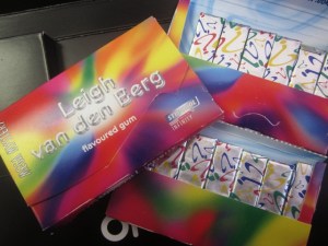 So, what does Leigh van den Berg flavoured gum taste like? You’d expect it to be all ‘peppermint lip gloss with a subtle Pongraz tang’ but it’s actually rather passionfruit-y. At least that’s what I think. My sister, however, reckons it’s more ‘grapefruit-y’ but after seeing it was supposed to be Leigh-flavoured she suddenly decided it had more of a ‘stupid old whore’ vibe going on. (Nice Mandy… real nice… ) But ja… either way, it’s definitely my favourite Stimorol flavour so far.