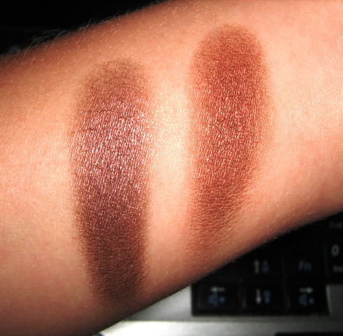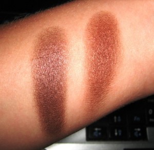 Quality-wise, they’re fabulous in that the pigmentation is amazing and they glide onto your skin with the greatest of ease. I also adore the colours I picked. 421 is a chocolate-y hue that looks great both day and night and 423 is more of a brown-gray, if that makes sense. When I wear them, I do so alone, just as a single wash over my entire lid with a little highlighter on my brow bone. I wore the brown-gray shade to the Steve Madden launch the other day (it’s a fab ‘brown’ for night-time) and actually had someone tell me they liked my eye shadow. Nice!