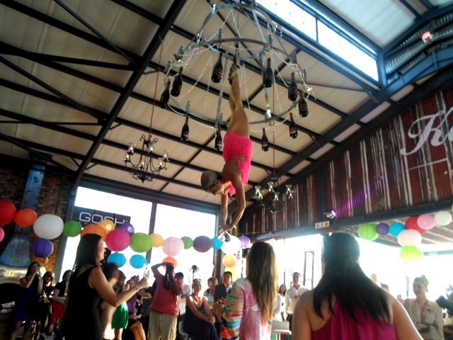 The height of awesomeness, however, was when a gorgeous acrobatic dancer descended from the ceiling, popped open a champage bottle and proceeded to fill everyone’s glasses from the air.