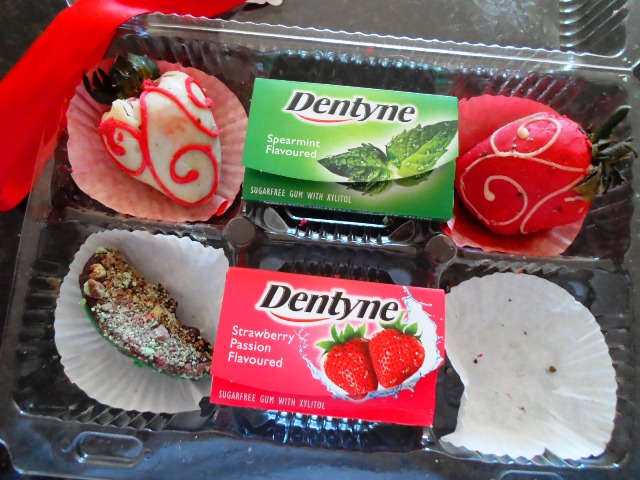 Aside from the two new chewing gum flavours, it included two choc-covered strawberries and faux mint leaves created from apple slices and dark-mint choccie crumble. (There were actually two of those but I lost it and stuffed one in my mouth within seconds of opening the pack. I just couldn’t wait until morning when I could get better light for a shot; mint-choc anything is my Kryptonite.)