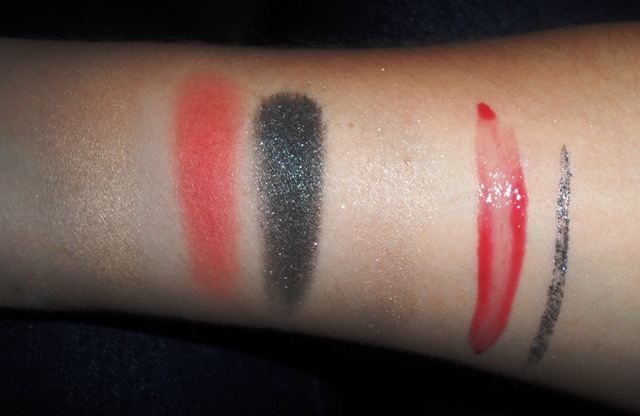 As for the red lip gloss, I reckon it’ll appeal to anyone looking for a non-sticky, sheer candy apple red gloss; just bear in mind it’s got fairly noticeable gold glitter in it and, because it’s non-sticky, it sides off super fast. Oh! And the glitter liner was a bit of a disappointment. I had to go over the line about six times (and painstakingly so) for it to show up.