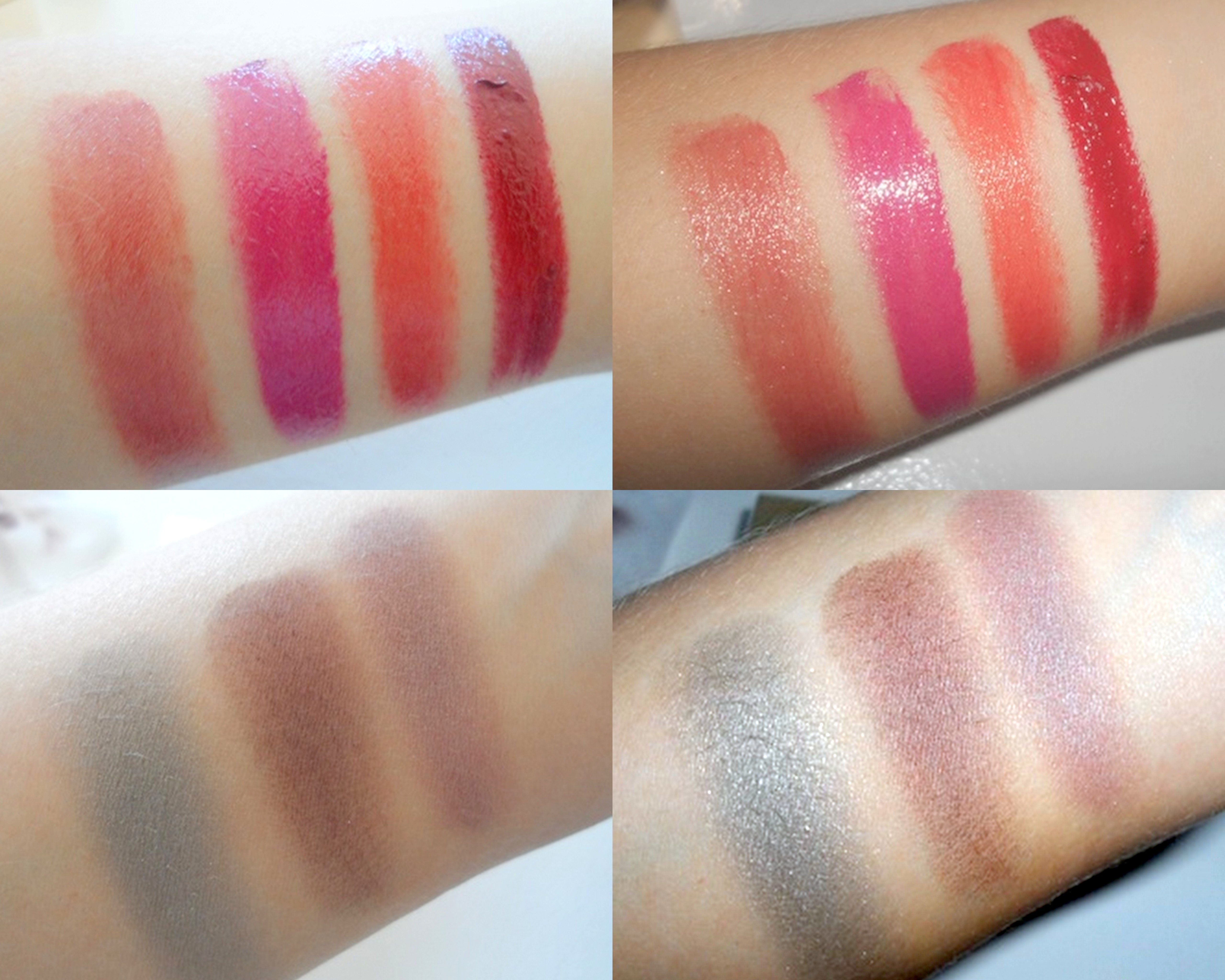 The lippies are fabulous; pigment rich and lustrous-looking and feel soft and creamy on your lips. The shadows look a lot sheerer on your skin than they do in the pan but can be built up with several strokes and have a nice satin finish.