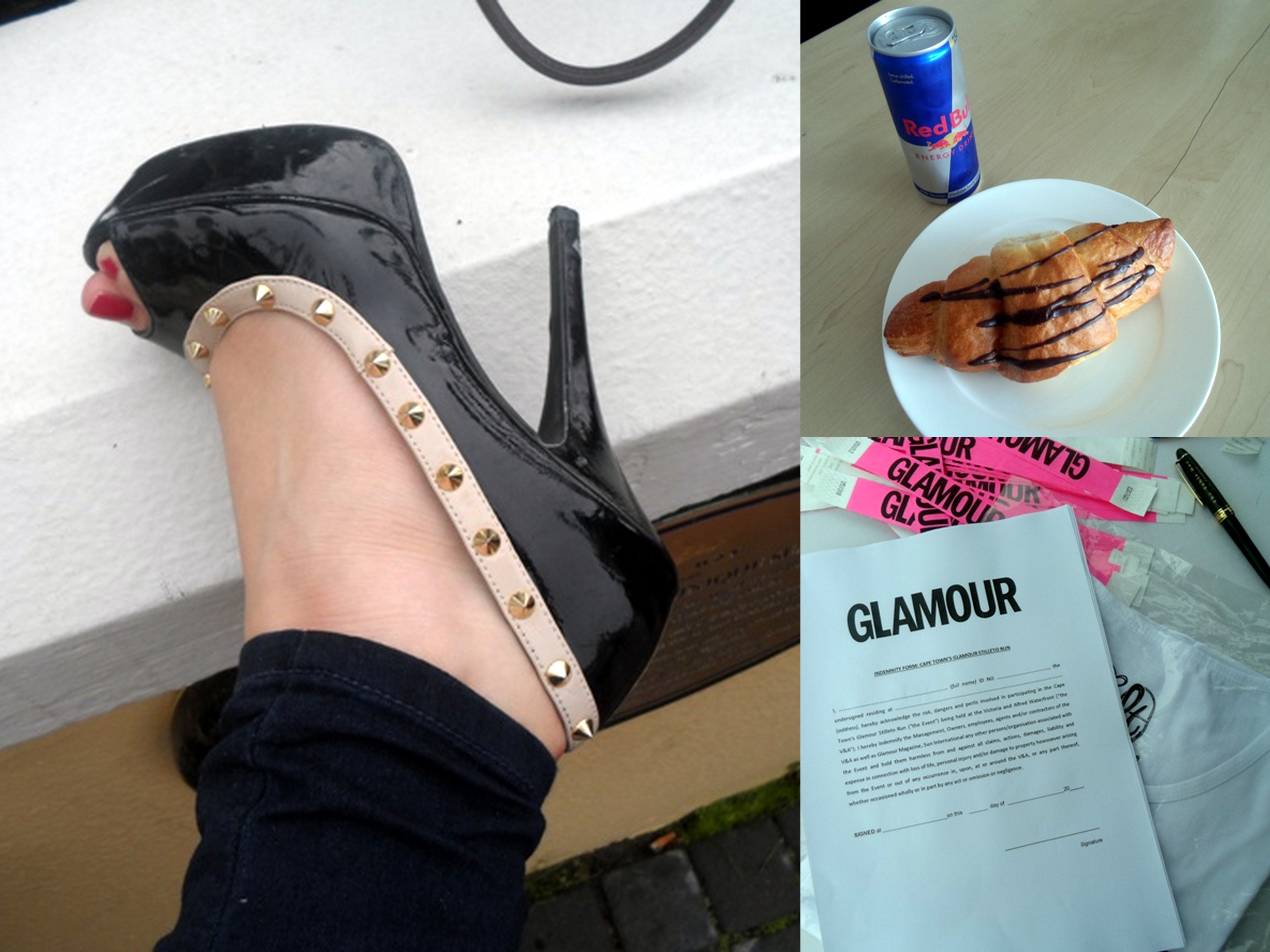 This weekend myself and fellow blogger besties Clouds and Karisa were invited to take part in Glamour magazine’s annual Stiletto Run held at The Table Bay Hotel. Essentially, you have to do a 100m dash in a pair of stilettos (they need to be at least 7cm high) and pray to the fashion gods that you don’t fall on your ass or worse. They even make you sign a scary li’l indemnity form. It’s pretty serious shizz which is why I didn’t mess around. I got an early night the night before and woke up to carbo-load with a chocolate croissant and Red Bull.