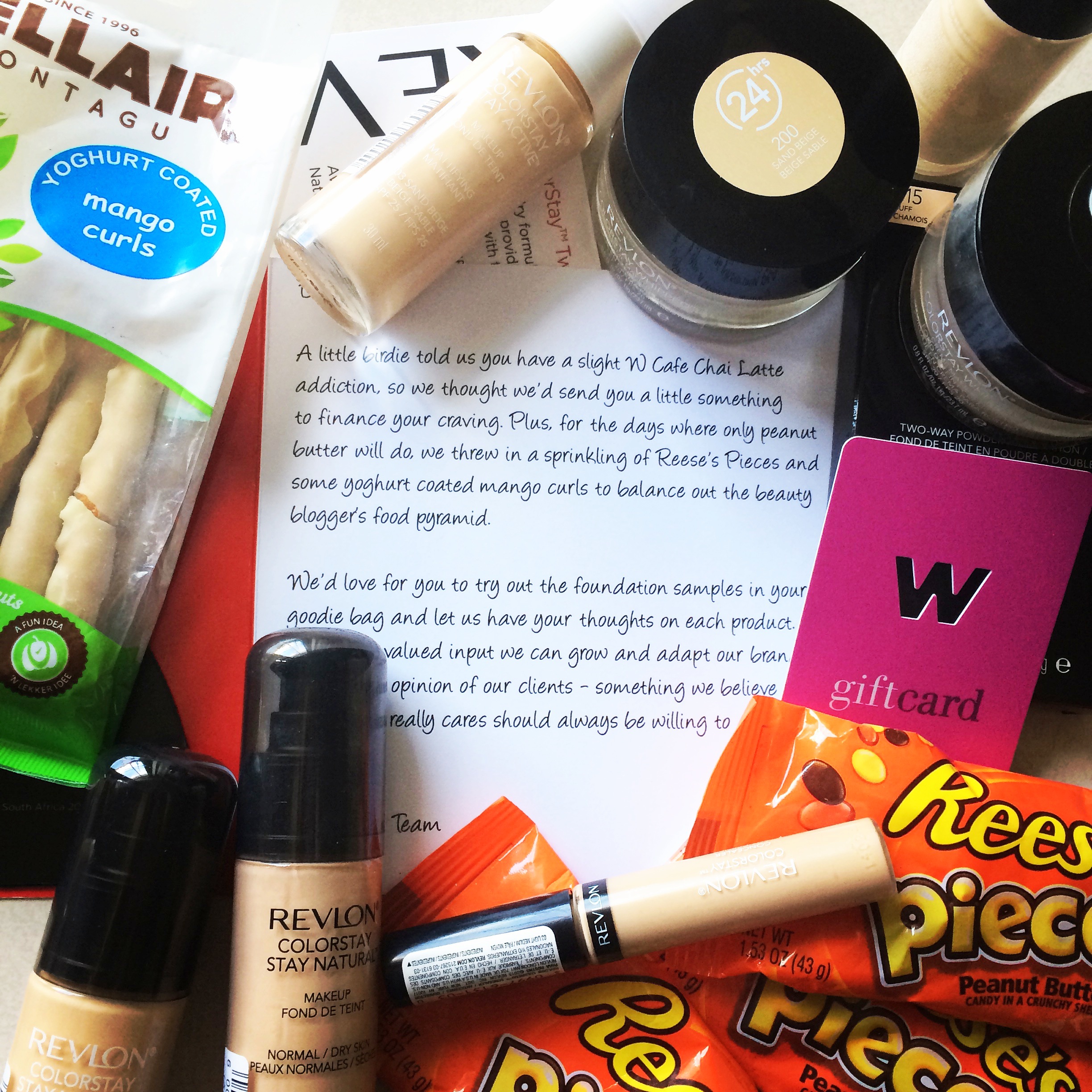 A little while back Revlon sent me a bunch of their foundations to try along with the most thoughtful press pack ever. It included a Woolworths’ gift card (so I could go binge drink W Cafe’s Chai lattes) and two of my favourite treats – yoghurt-covered dried mango and Reese’s Pieces.