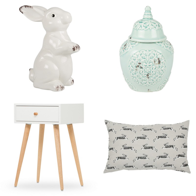 Going clockwise:  Standing rabbit R229, Antique scroll jar R129, Hares print cushion R229 and retro pedestal R899.