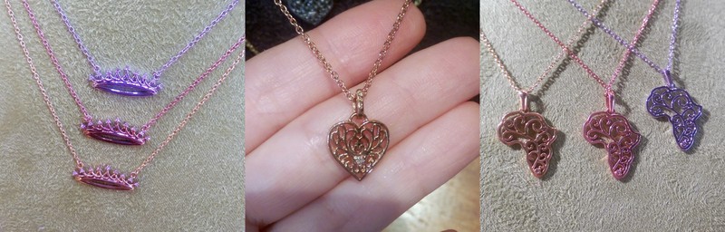 From left to right: Crown diamond pendants R1 800 each, filigree diamond pendant R900 and map diamond pendants R1 200 each.