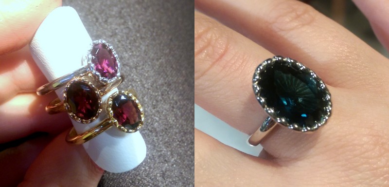 On the left: Rhodolite rings R1 200 each. On the right: Topaz ring R4 300.