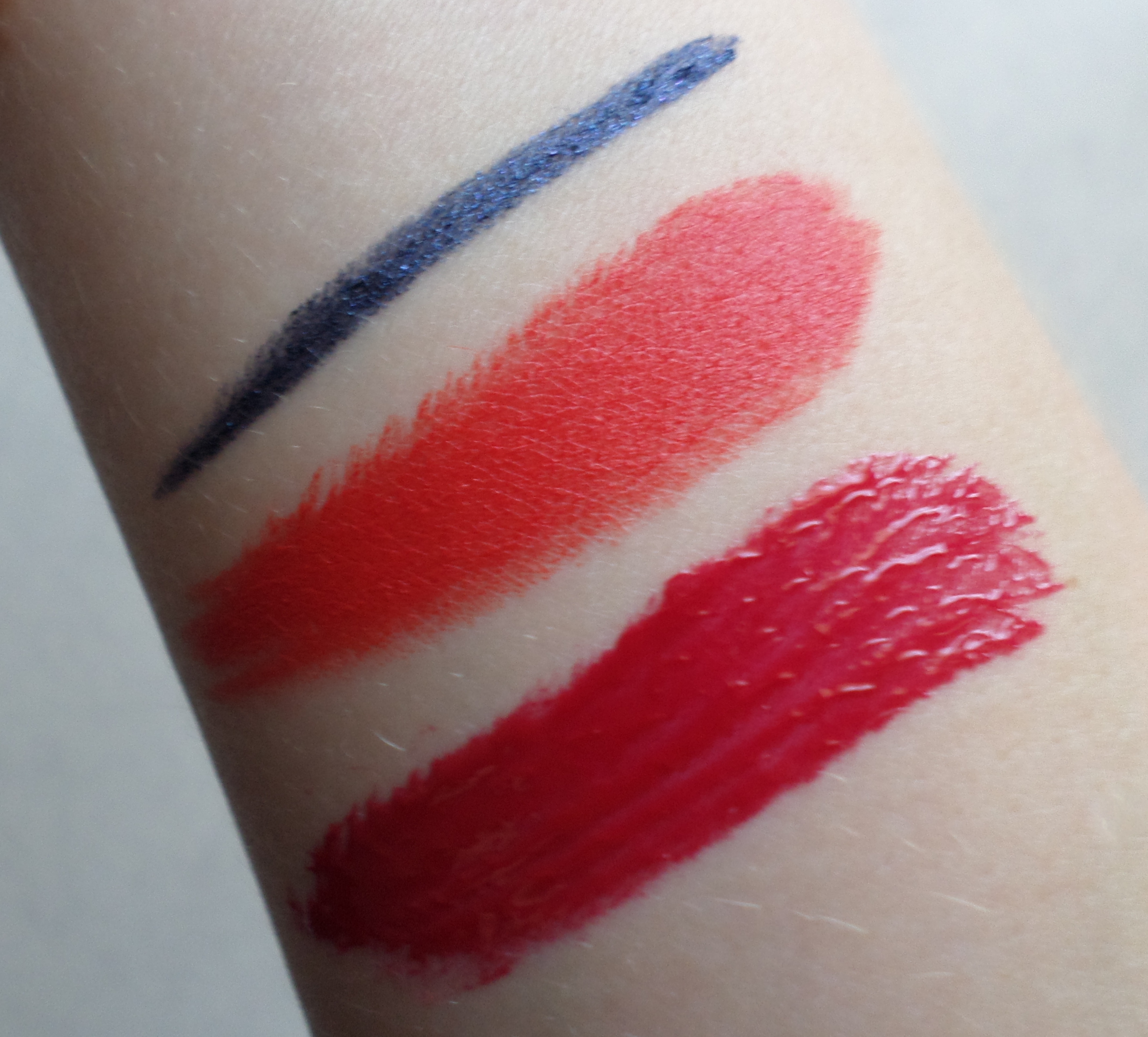 From the top: Pearlglide Intense Eye Liner in Petrol Blue, lipstick in Barbecue and Lipglass in Victoriana.