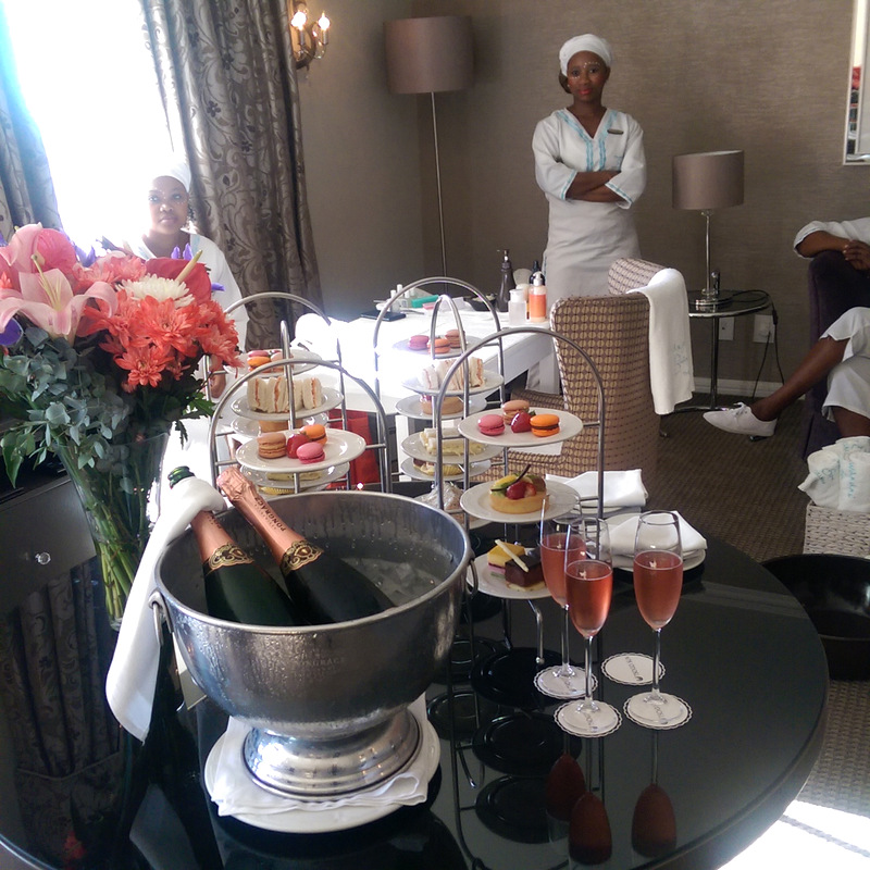 Hannes then showed us to yet another suite where – surprise! – a host of the hotel’s lovely Mangwanani therapists had set up an indulgent high tea and pop-up salon to treat us to manis and pedis. (The hotel’s recently renovated it’s spa which is now a ‘Mangwanani Boutique’ one. You can read all about that over here.)