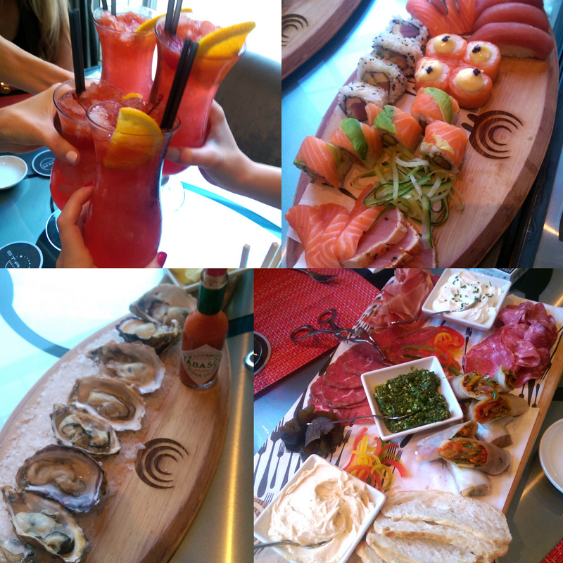 I’m not one hundred percent sure what was in the cocktail but it had a yummy ginger-amaretto taste, was created especially for us and referred to as a ‘Candy Ginger’. Sooo delish! And speaking of, we nearly died (from awesome) when we saw the mezze. It turned out to be a smorgasbord that included beautifully presented super fresh sushi and oysters (my favourite, reeeee!) as well as a charcuterie and cheese platter with dips. One of the best things about that experience was the fact that Sheri and Karisa don’t eat oysters. Yes! Air punch! (And another punch to Brigitte’s face if she attempts to eat more of them than I do.)