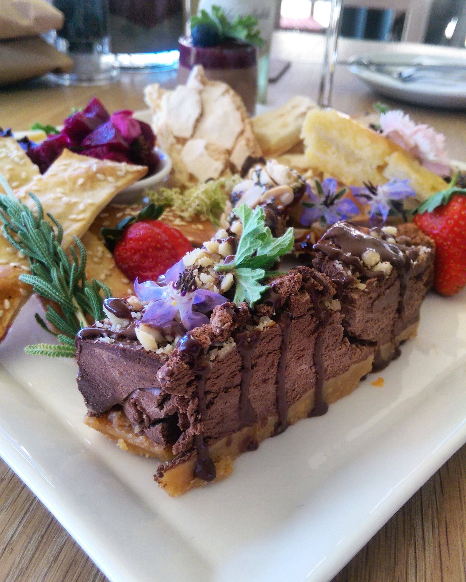 As far as great restaurant specials go its a real gem ‘cos, for just R690, both you and your dining buddy are treated to a giant platter boasting a selection of their lunch menu’s best offering plus a dessert platter you probably won’t finish and its paired with wine – their lovely new MCC Blanc de Blancs on arrival, a glass of Rhinofields red with your mains and a sweet ‘dessert’ wine (Durbanville Hills Noble Late Harvest) to finish things off.