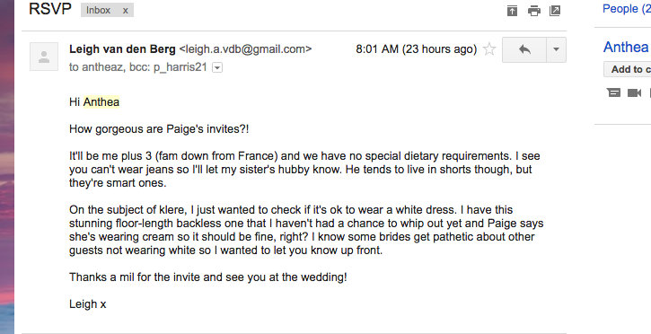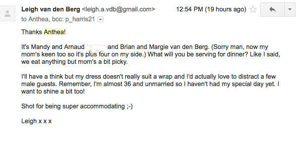Once I hit send, I sat back and rubbed my wicked little hands with glee. How long would it take for her to realise I was joking? Or, would she totally take the bait and whip out a snippy e-mail letting me know that, no, I can’t wear a sletterig wit rok to her daughter’s special day. But to my surprise she sent me this…
