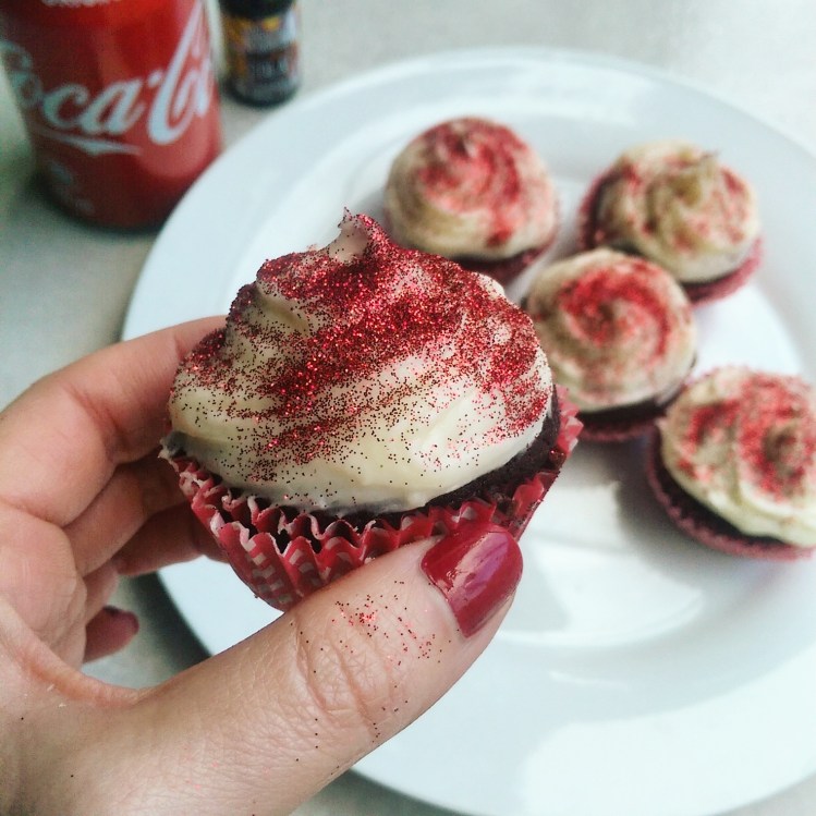 I initially planned to decorate each cupcake with a gummy cola bottle (Haribo makes them) but couldn’t find any in store so I settled, rather glamorously, for scarlet edible glitter that I found at The Baking Tin in Belvedere road in Claremont.